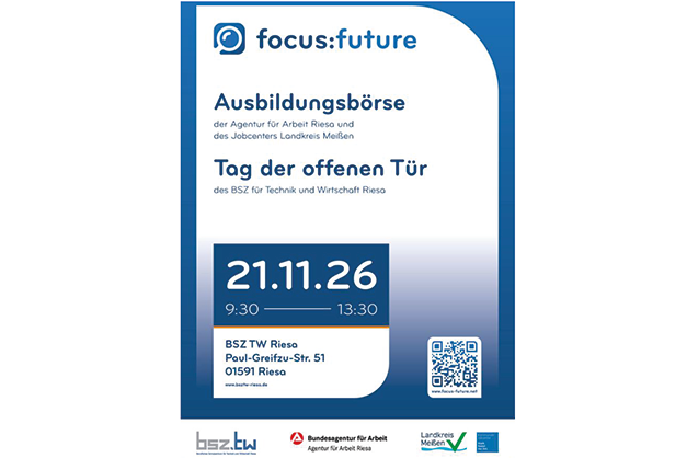 Am 21. November 2026, von 09:30 bis 13:30 Uhr ist es wieder so weit: Der Tag der offenen Tür sowie die Ausbildungsbörse der Agentur für Arbeit und des Jobcenters des Landkreises Meißen öffnet ihre Türen im Beruflichen Schulzentrum für Technik und Wirtschaft.